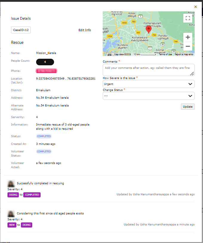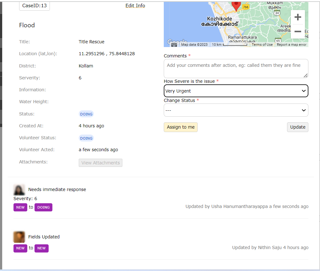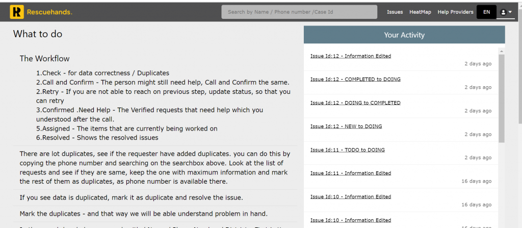 For example, assume that a person is willing to help people in rescuing. So they can create a ticket with issue type as rescue and mention the no of people they can rescue. Later based on the current situation, he can mention the severity and the status of the condition, whether he is successfully completed or in progress(doing) he can update the ticket. So these actions would be recorded and would be at the bottom of the ticket.In addition to this, if any other contributors are willing to the help same. They can just do it in a single click ‘Help now’. The action would also be recorded and would be seen in the list.
